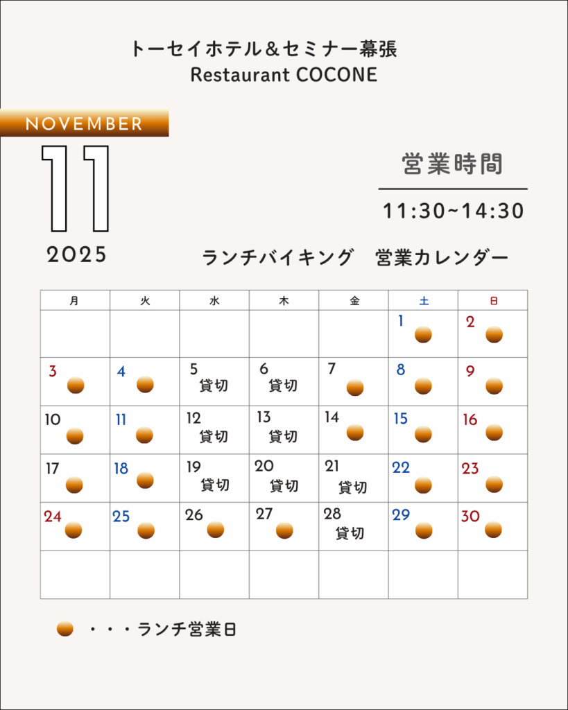 11月のレストランココネのランチ営業について、下記スケジュールのとおりご案内いたします。
