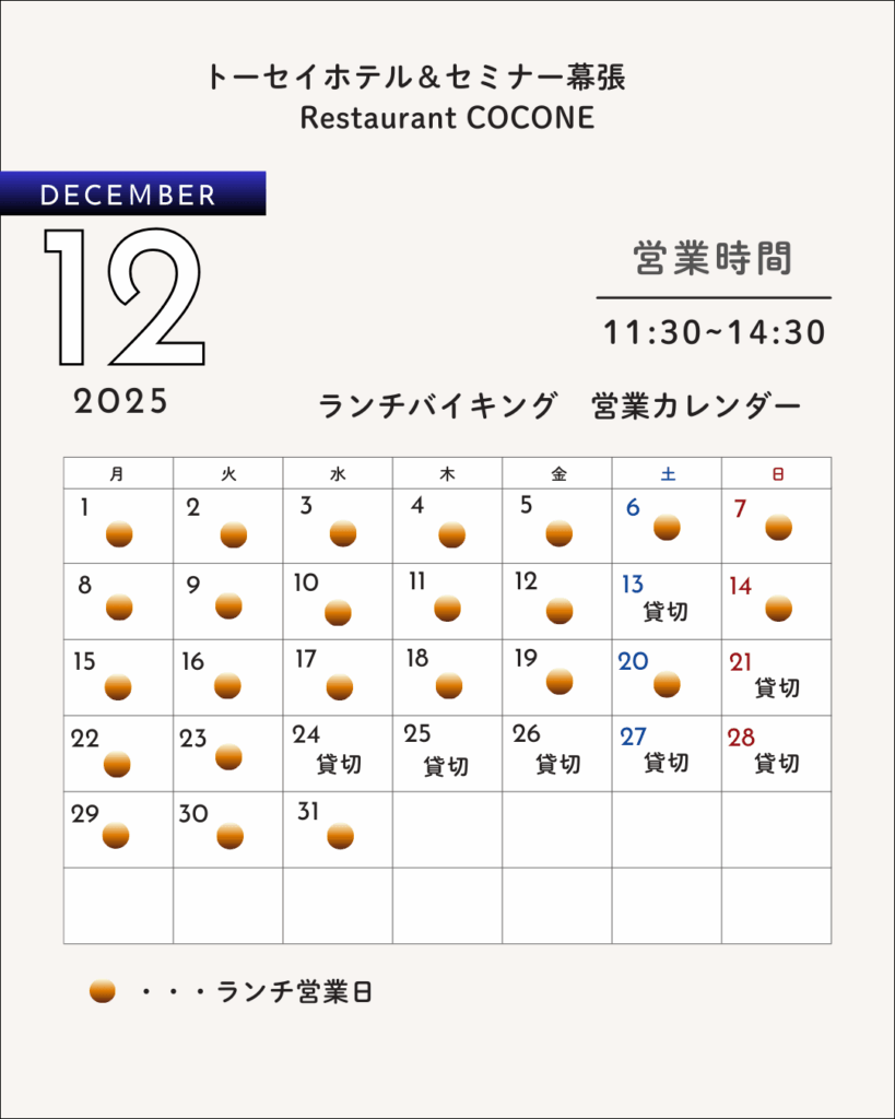 12月のレストランココネのランチ営業について、下記スケジュールのとおりご案内いたします。