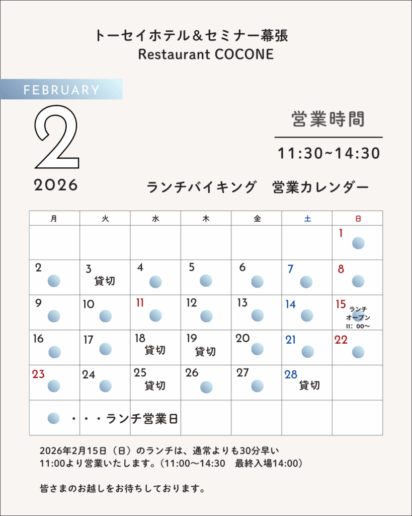 2月のレストランココネのランチ営業について、下記スケジュールのとおりご案内いたします。